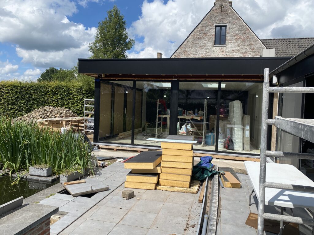 Ook binnen kreeg de leefruimte een volledige renovatie. De bestaande chape lag nog op zavel en werd volledig uitgebroken. Er kwam een nieuwe betonplaat met isolatie, afgewerkt met keramisch parket dat mooi aansluit bij de bestaande vloer in de keuken.